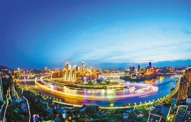 커튼 아래의 유중 반도는 특히 매혹적이며, 장강과 가령강을 항해하는 관광 유람선은 찬란한 빛과 그림자를 남겼습니다 사진=수시 기자
