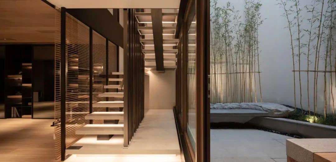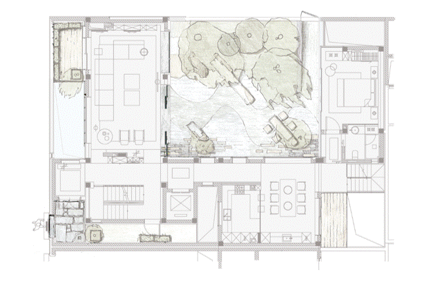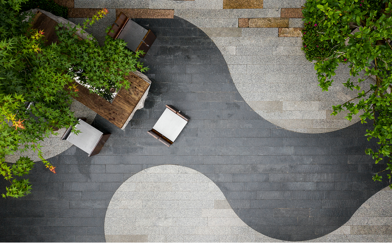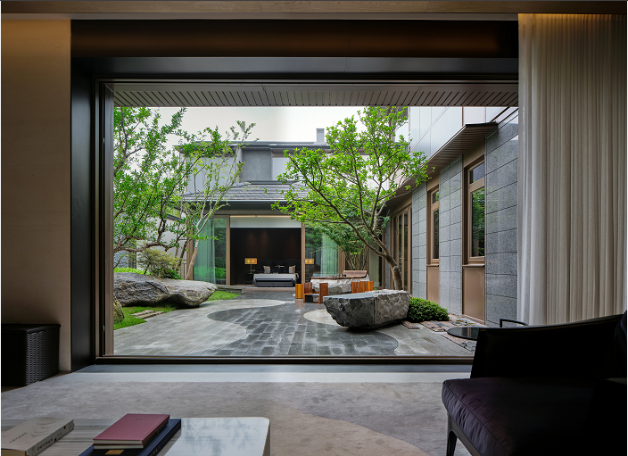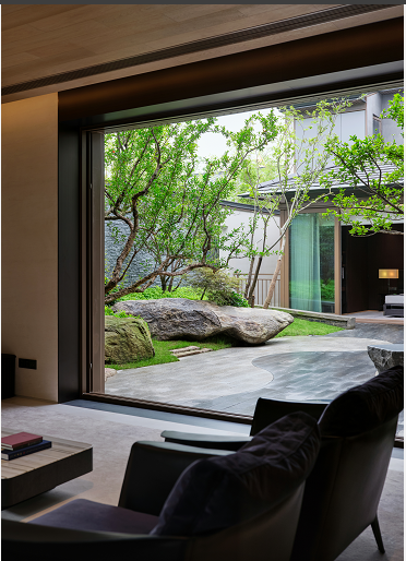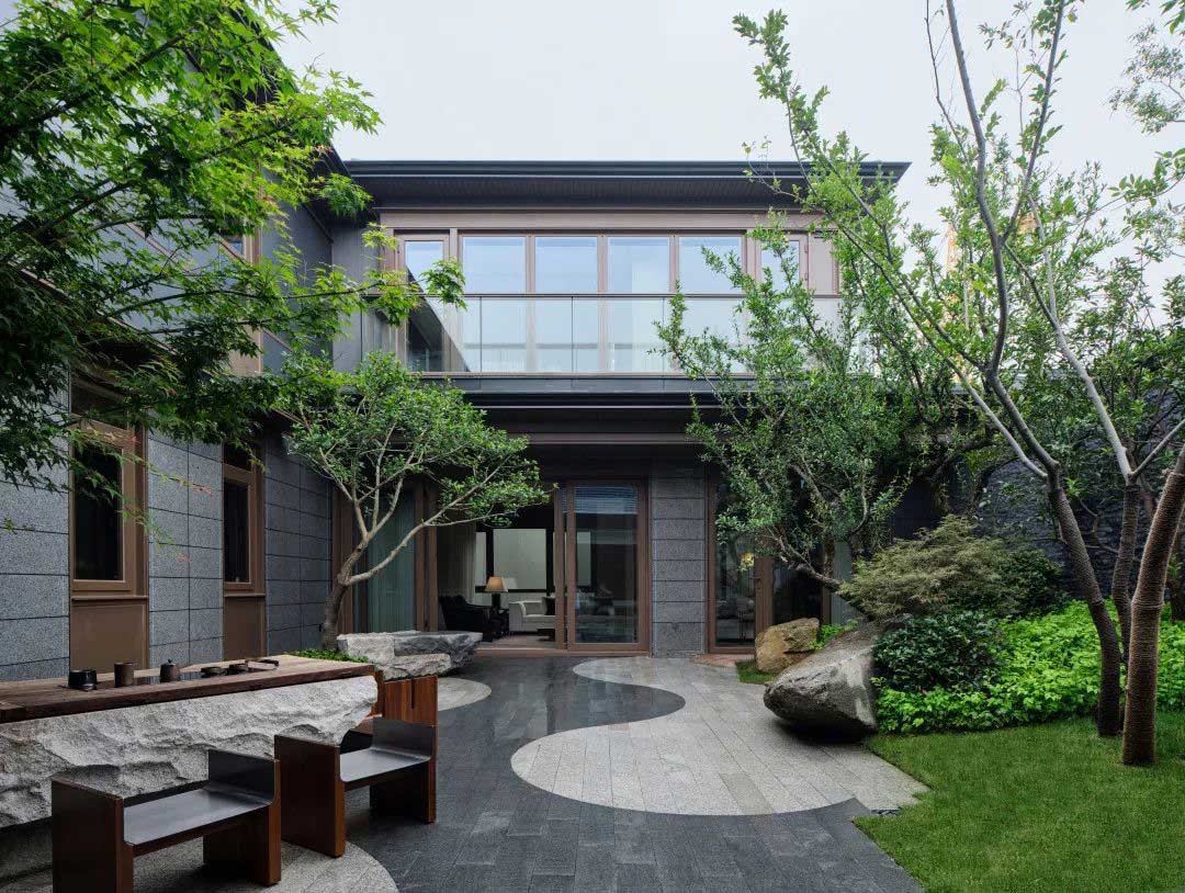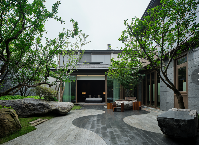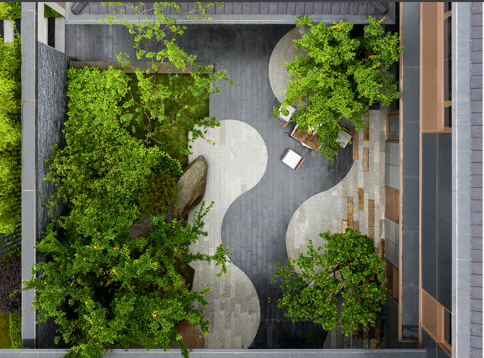 "오리진" 거실은 흐르는 강물처럼 포장되어 있습니다 회색과 흰색 포장만을 사용하여 우아한 곡선의 윤곽을 그립니다 물마을의 부드러움을 보여줄 뿐만 아니라, 시선을 유도하고 확장감을 높이는 기능도 가지고 있다정원은 크지는 않지만 매혹적입니다