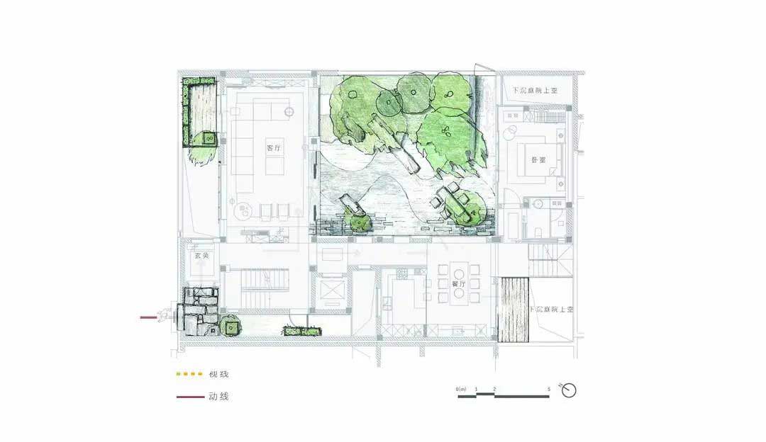 공원은 공공장소와 가깝고 이를 연결하는 작은 문이 있고, 공용배관과 배전함의 개구부가 벽의 측면에 집중되어 있기 때문에 벽에 경사면을 쌓아 '산'으로 사용합니다 [산]은 거실에서 시작해 정원 문에서 끝난다 식물을 배치하여 시야를 차단하고 벽체 내부와 외부의 녹지를 연결하는 탁월한 효과를 얻을 수 있습니다