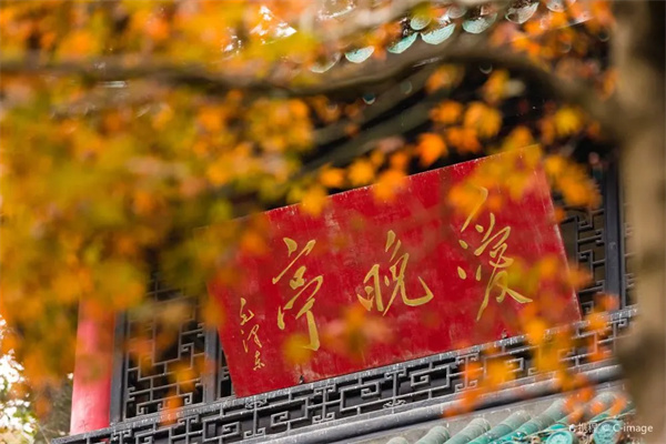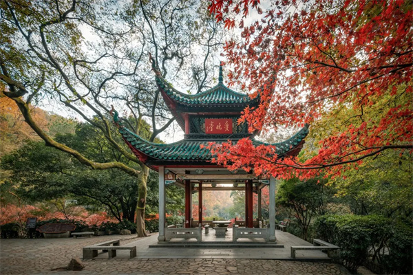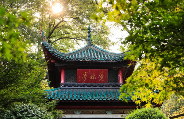 아이완정은 악록서원 청풍협 뒤 언덕에 위치해 있습니다 청나라 건륭제 57년(1792년)에 건립되었습니다 청나라 악록서원의 교장인 낙전이 창안한 것입니다 원래는 Ai Feng Pavilion으로도 알려진 Hongye Pavilion이라고 불렸습니다 그 후 호광태수 비원(毛源)이 밤에 단풍나무 숲에 차에 앉아 있다는 시에 따라 이름을 애완정으로 바꾸었고, 2월의 서리잎은 꽃처럼 붉다 누각의 형태는 이중 처마와 8개의 기둥으로 되어 있으며 유약 녹색 타일과 날아다니는 모서리가 있습니다 멀리서 보면 마치 하늘을 날아갈 것 같은 느낌이 들고, 전체적으로 부드럽고 가볍습니다 안쪽 금기둥은 붉은색 칠을 한 둥근 나무로 만들어졌고, 바깥쪽 처마 기둥 4개는 정사각형 화강암 전체로 만들어졌습니다
