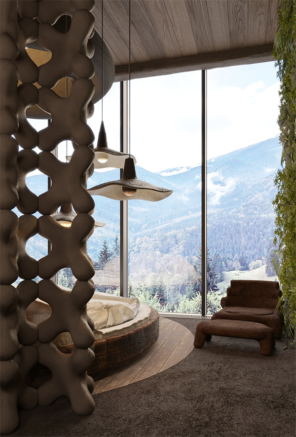 의 원형 몸체는 주변 자연 환경을 마주카지노 슬롯 있으며, 독창적인 질감의 목재, 콘크리트 및 점토 재료를 많이 사용하여 거칠고 실제적인 자연 질감을 표현하기 위해 노력합니다