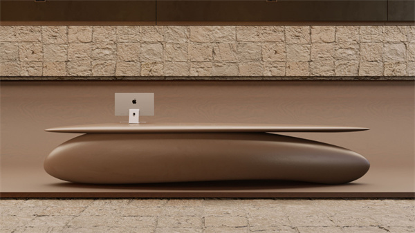 접수실의 유선형 구리 접수 데스크 옆에는 구형 조각품이 있고 그 뒤에는 반쪽짜리 자연석 질감의 벽이 장식되어 있습니다 전반적인 디자인은 미래주의로 가득 차 있습니다