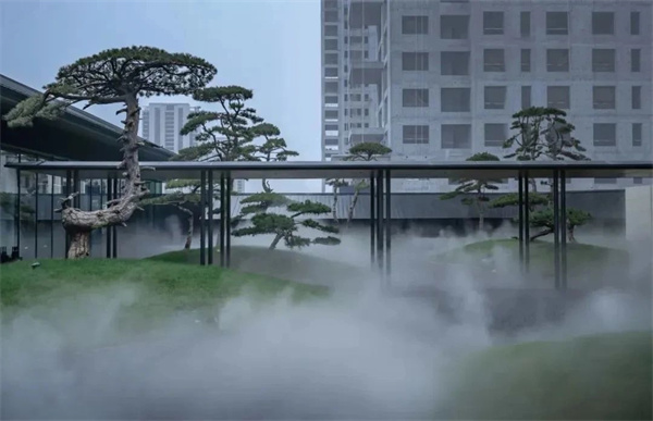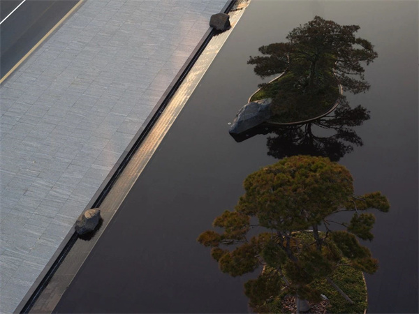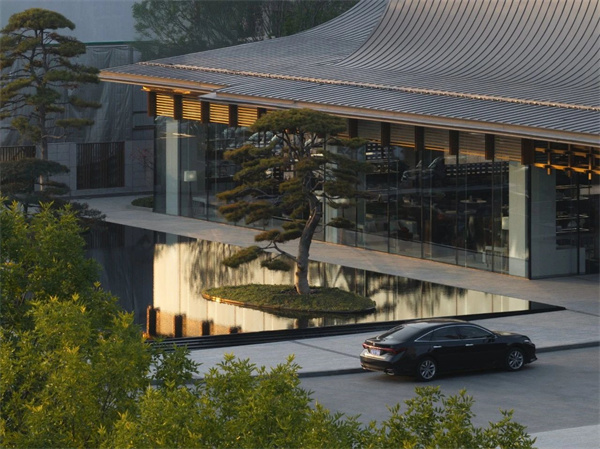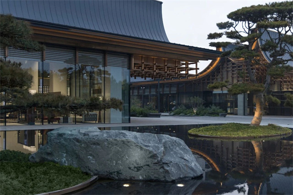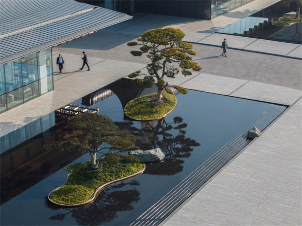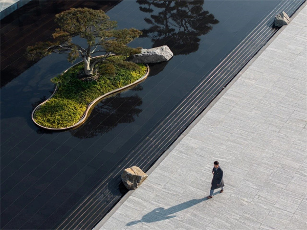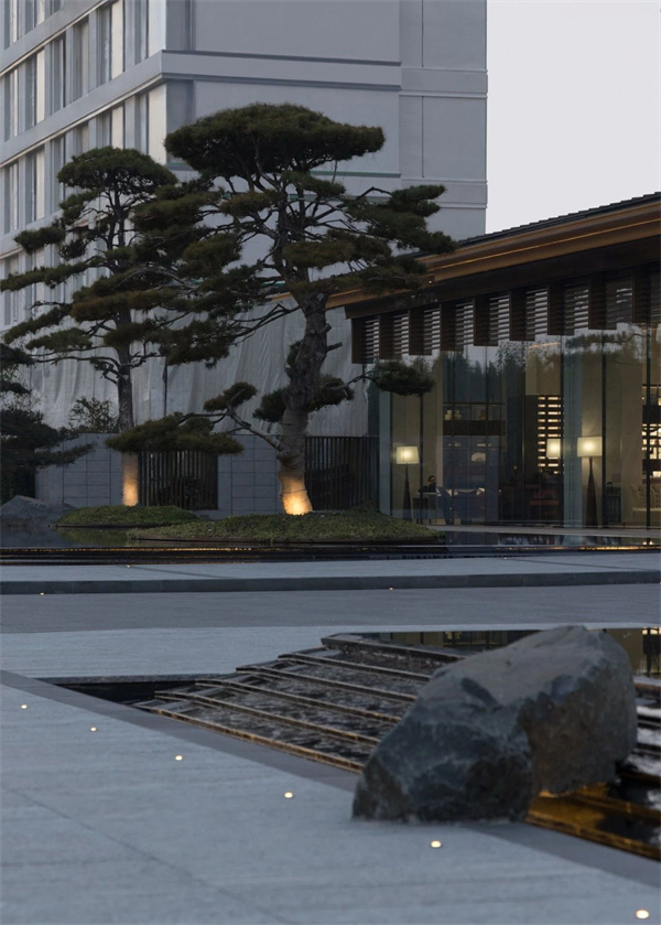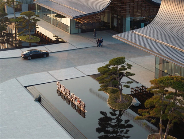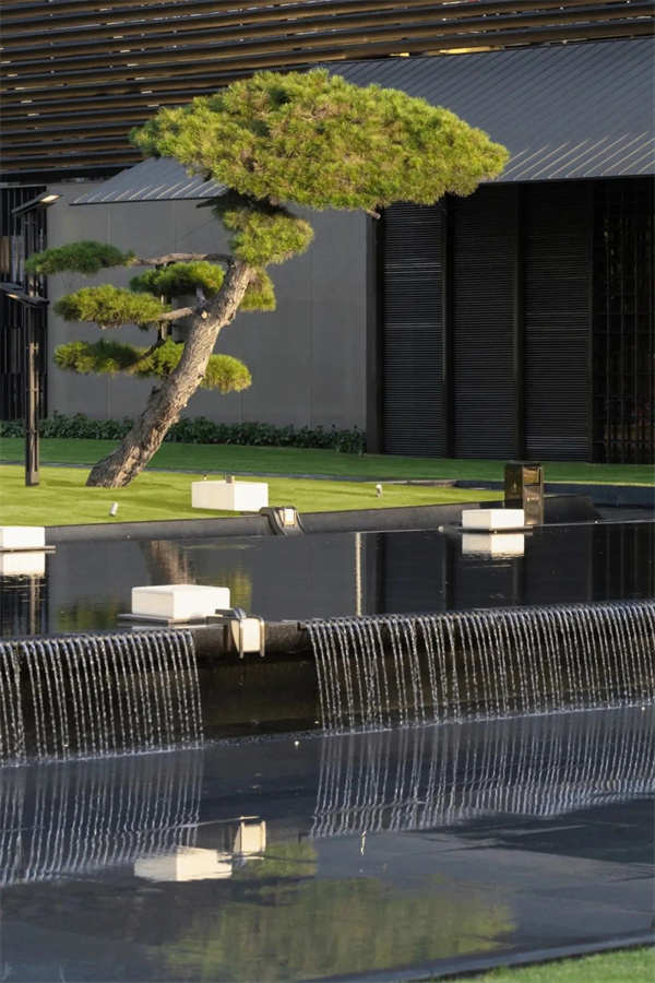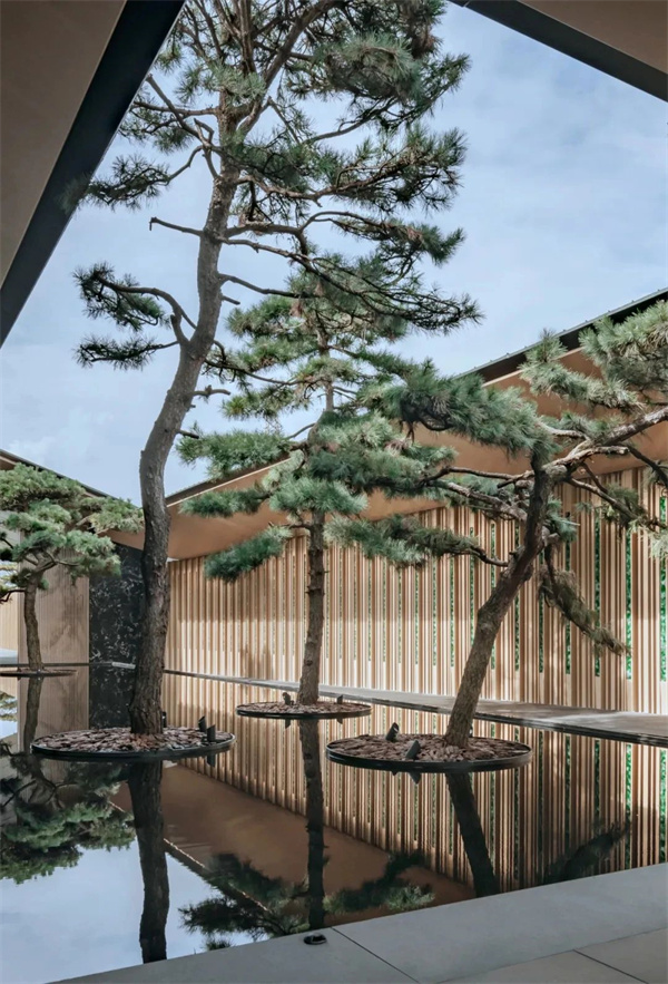 100m 길이의 도시 인터페이스는 동양적 융합의 디자인 철학을 따릅니다 손님을 맞이하기 위해 양쪽에 자유형 소나무 숲이 시작됩니다 축은 고대 보저우(Bozhou) 해자의 배치에서 따왔으며 물이 해당 지역으로 유입됩니다