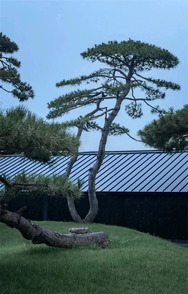 문 양쪽에는 세련된 소나무가 심어져 있으며 땅에서 솟아올라 중앙 축에 의식적 대칭성을 만들어냅니다 100m 길이의 소나무 숲은 힘찬 자태로 마치 수묵화처럼 아우라 같은 두루마리를 그려낸다